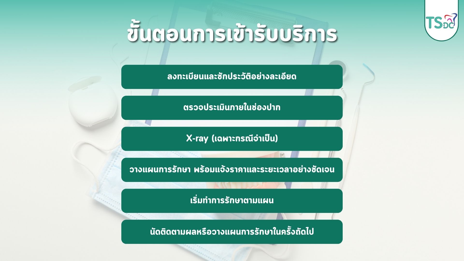 เมื่อเดินเข้าคลินิกทันตกรรม ผู้เข้ารับบริการมักจะพบขั้นตอนหลัก ๆ ดังนี้ ซึ่งช่วยให้การรักษาเป็นระบบ ชัดเจน และสามารถตรวจสอบได้ทุกขั้นตอน